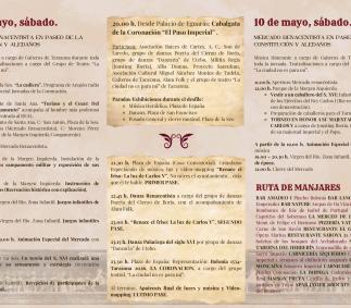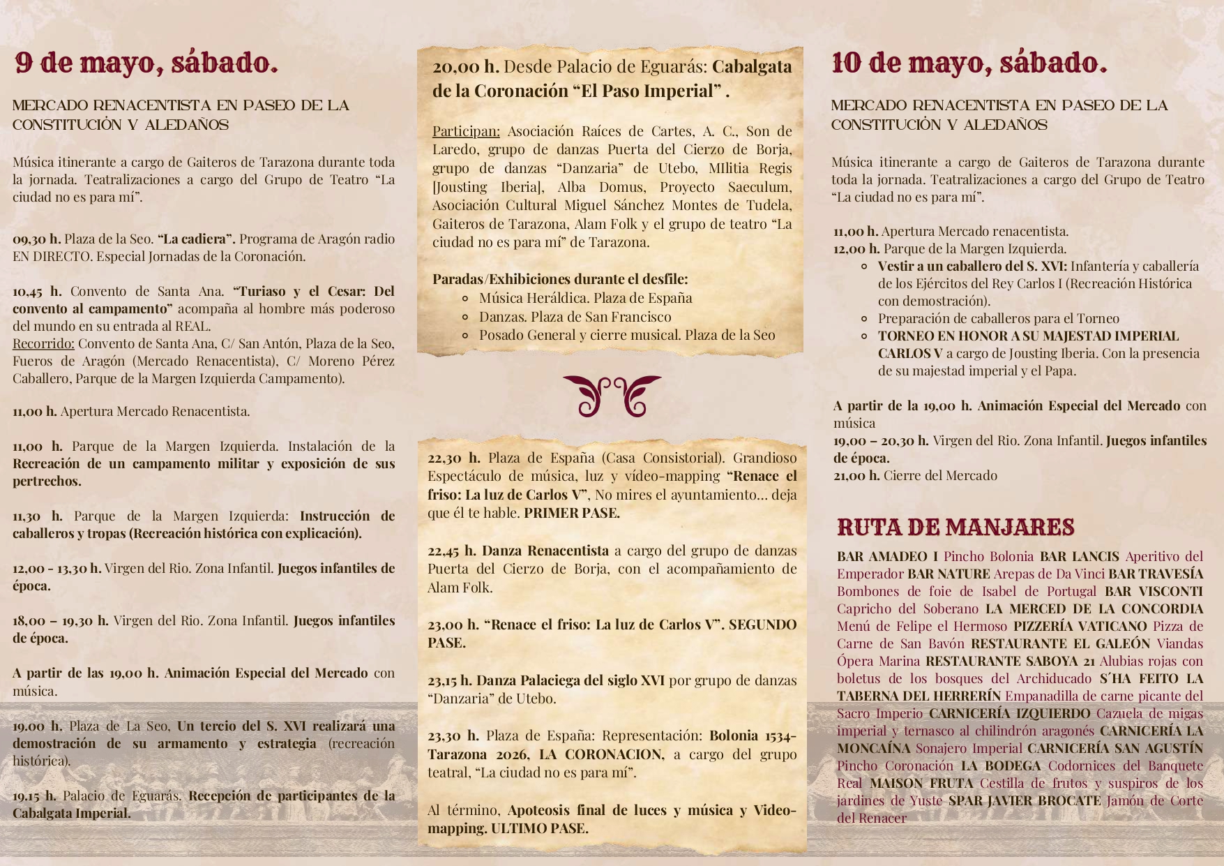 20,00.- Desde Palacio de Eguarás: Cabalgata de la Coronación “El Paso Imperial” Participan:  Asociación Raíces de Cartes, A. C. Son de Laredo, grupo de danzas Puerta del Cierzo de Borja, grupo de danzas “Danzaria” de Utebo, MIlitia Regis [Jousting Iberia], Alba Domus, Proyecto Saeculum, Asociación Cultural Miguel Sánchez Montes de Tudela, Gaiteros de Tarazona, Alam Folk y el grupo de teatro “La ciudad no es para mí” de Tarazona