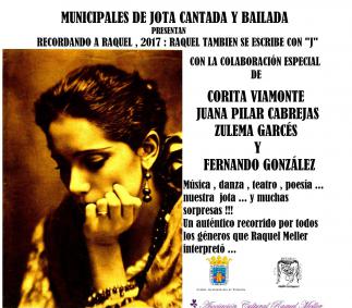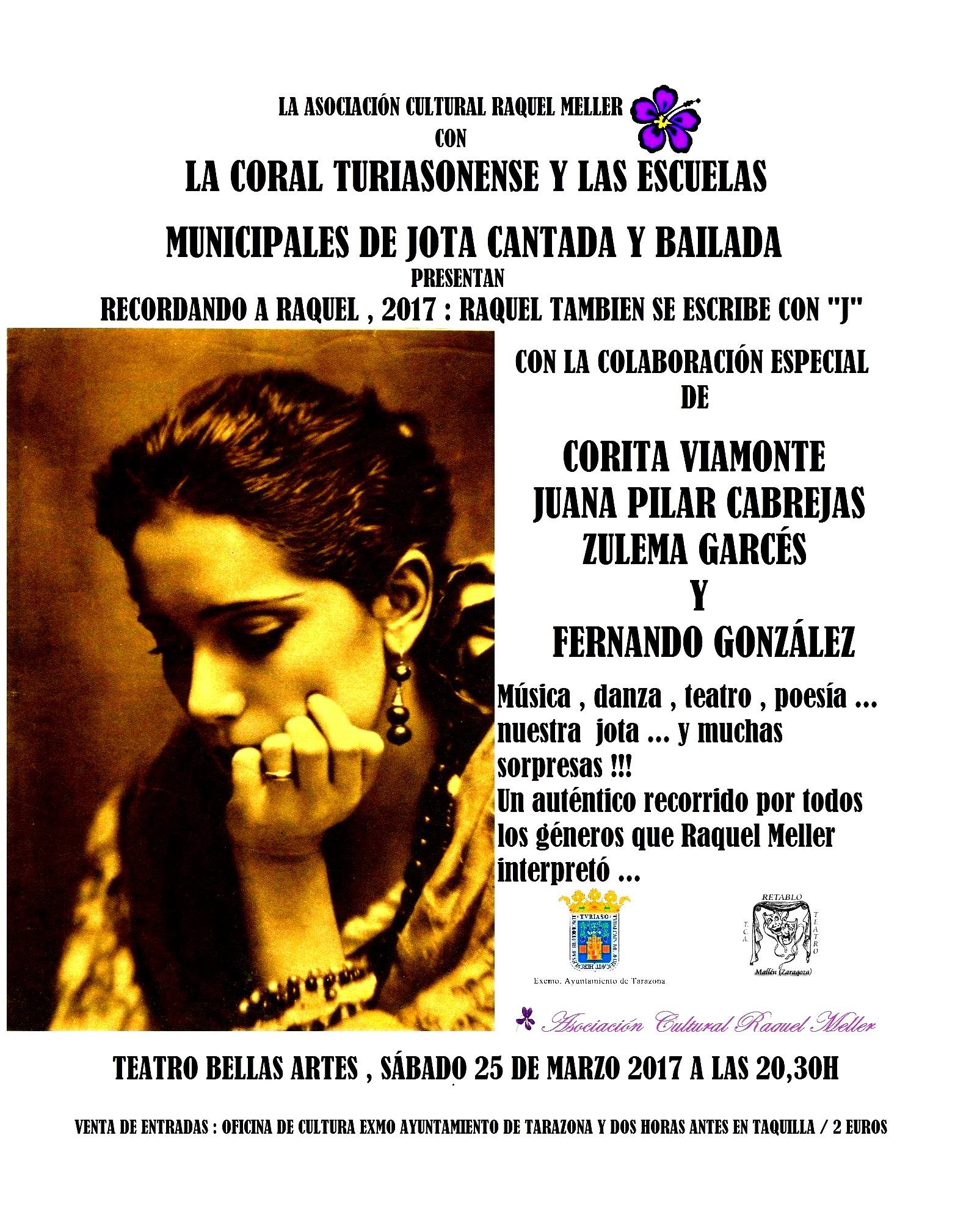La Asociación Cultural Raquel Meller, el Ayuntamiento de Tarazona con las Escuelas M. de Jota Cantada y Bailada, presentan: “RECORDANDO A RAQUEL, 2017: RAQUEL SE ESCRIBE CON JOTA”. Con la colaboración especial de: Coral Turiasonense, Corita Viamonte, Juana Pilar Cabrejas, Zulema Garcés y Fernando Gonzalez, y música, danza, teatro, poesía, ...nuestra jota ... Y muchas sorpresas!!!