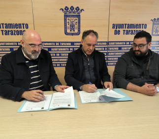 El alcalde de Tarazona, Tono Jaray, acompañado por la concejal de Bienestar Social, Lourdes Sánchez, ha firmado el convenio de colaboración con el presidente del Comité Local de Cruz Roja en Tarazona, Javier Lasheras, y con el representante de Cruz Roja Española, Francisco Miguel Alcaraz Gual.