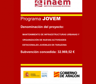 El Ayuntamiento de Tarazona, a través del programa JOVEM del Instituto Aragonés de Empleo, recibe este 2025 una subvención por valor de 32.969,52€ para el proyecto de mantenimiento de infraestructuras urbanas y organización de nuevas actividades estacionales juveniles en Tarazona