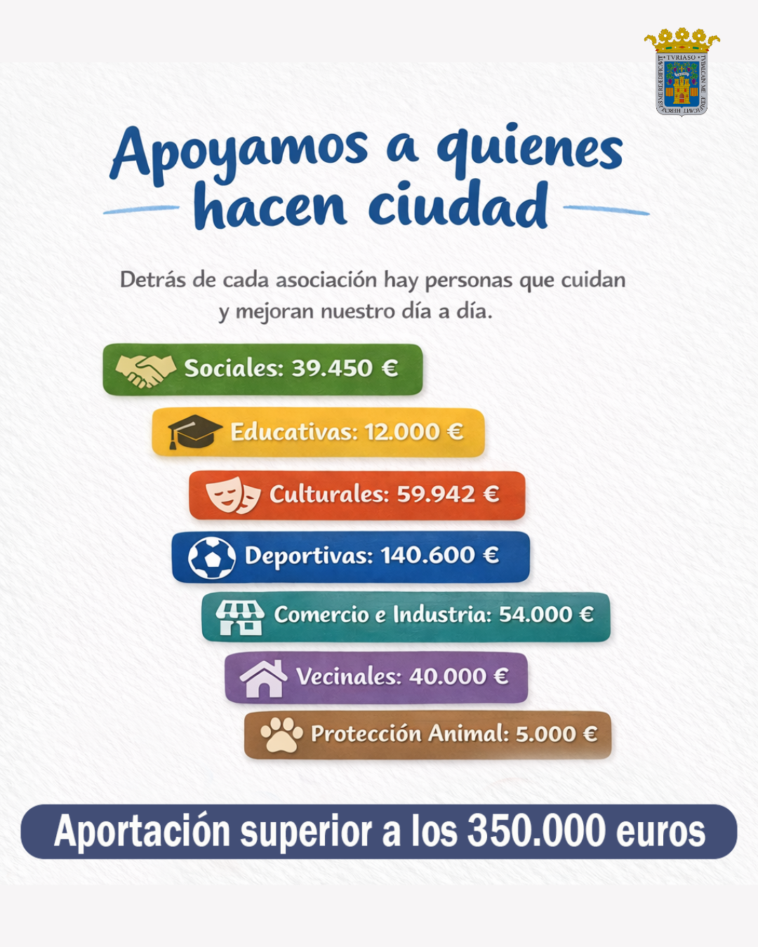 Estas ayudas reflejan el compromiso del consistorio con las asociaciones y entidades que desempeñan una labor fundamental en la vida diaria de la ciudad. En este sentido, la distribución de las subvenciones ha sido la siguiente: 39.450 euros destinados a entidades sociales, 12.000 euros al ámbito educativo, 59.942 euros al apoyo a la actividad cultural y 140.600 euros al fomento del deporte local. Asimismo, se han destinado 54.000 euros al impulso del comercio y la industria, 40.000 euros a las asociaciones vecinales y 5.000 euros a la protección animal.