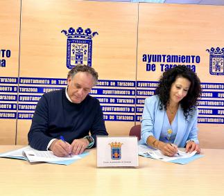 27 octubre 2025.-El alcalde de Tarazona, Tono Jaray, y la presidenta de la Coordinadora de Cofradías y Hermandades de Tarazona, Inmaculada Soria, han firmado este lunes un convenio de colaboración dotado con 7.500 euros, destinado a la promoción y desarrollo de los actos de la Semana Santa Turiasonense, declarada Fiesta de Interés Turístico Regional desde 2005 y que aspira a obtener el reconocimiento de Fiesta de Interés Turístico Nacional.